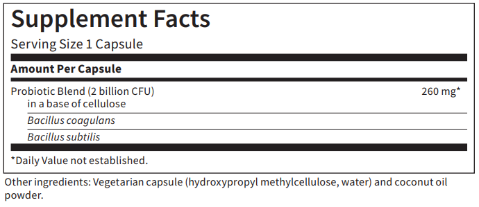 Germination of Bacillus spores within the human small intestine and transient colonization is now thought to be part of the normal life cycle of human-associated Bacillus species providing specific stimuli for healthy GI and immune system development and function. Each capsule of Ther-Biotic BioSpora supplies a total of 2 billion CFUs of B. coagulans and B. subtilis spores positively identified through independent 16S ribosomal RNA gene sequencing.