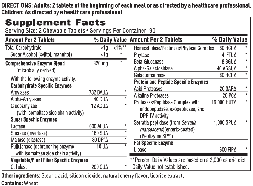Serratia peptidase, a unique endopeptidase enzyme, helps protect sensitive GI tissue from irritation that can affect tissue health and intestinal comfort. Enzymes with DPP-IV activity and a full range of disaccharidases are included.