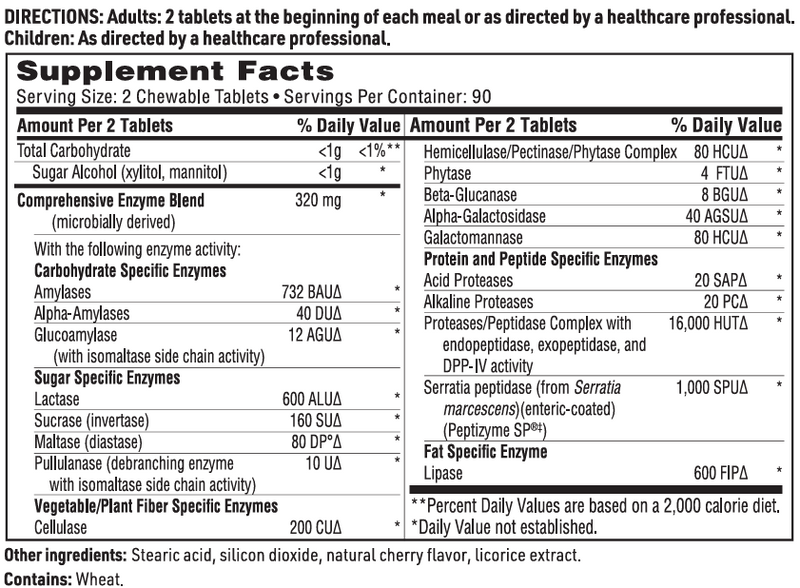 This broad-spectrum enzyme formulation has moderate amounts of enzymes compared to Vital-Zymes Complete to allow it to be comfortably chewed for routine daily use or as needed. Vital-Zymes Chewable can assist in the breakdown of a wide range of proteins, peptides, fats, complex carbohydrates, sugars, and fibers.