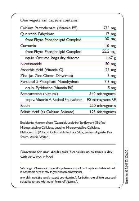 My skin contains a synergistic blend of quercetin and curcumin phospholipid complexes, zinc, vitamins B3 and B6.