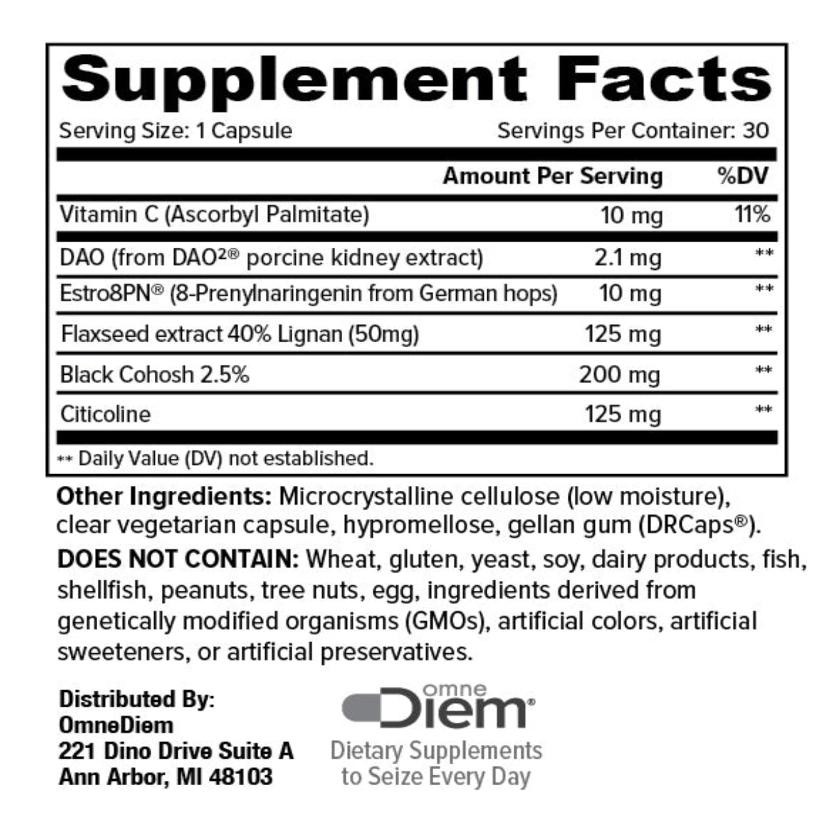 OmneDiem® Histamine Digest® Menopause Complete supports the body’s healthy response to the natural changes occurring during menopause. The addition of DAO supports natural histamine levels and processing which are impacted by hormonal fluctuations.*