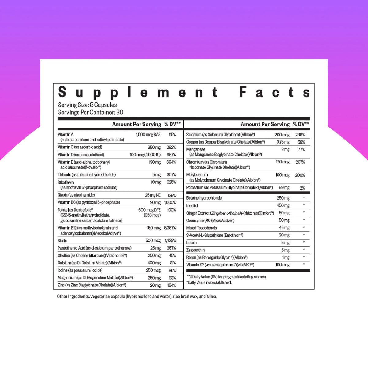 Vitamin A is included in two forms: beta-carotene and retinyl palmitate, to help support those who have trouble converting "provitamin" A compounds (such as beta-carotene) into the active retinyl/retinol forms. Vitamin C and coenzyme Q10 provide antioxidant support, supporting a healthy immune system and cellular integrity.
